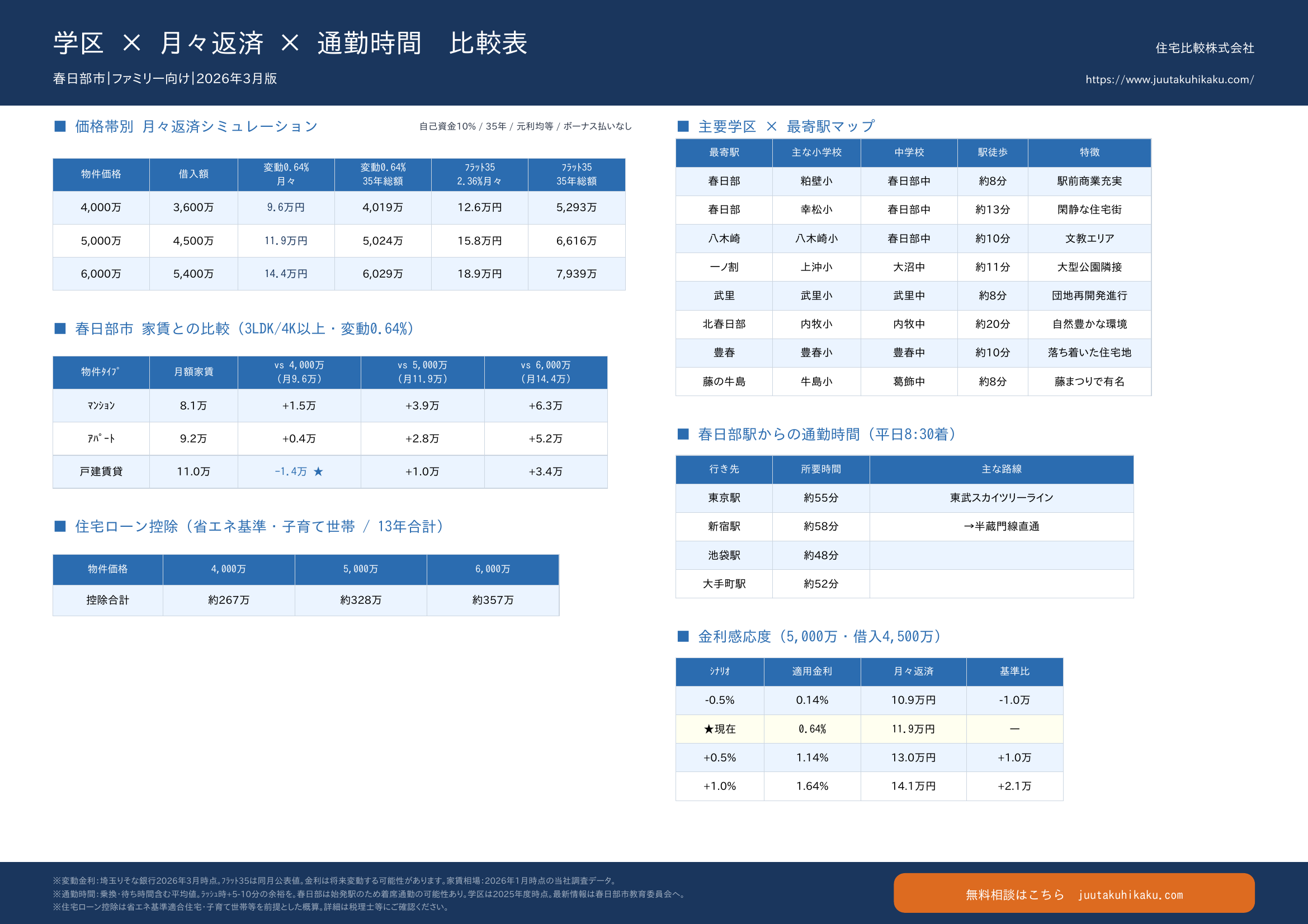 本記事のシミュレーションをさらに詳しくまとめた「学区×月々×通勤 比較表」をご用意しました。春日部市内の主要学区ごとに、物件価格帯・月々返済額・通勤時間を一覧で比較できます。無料相談のご案内